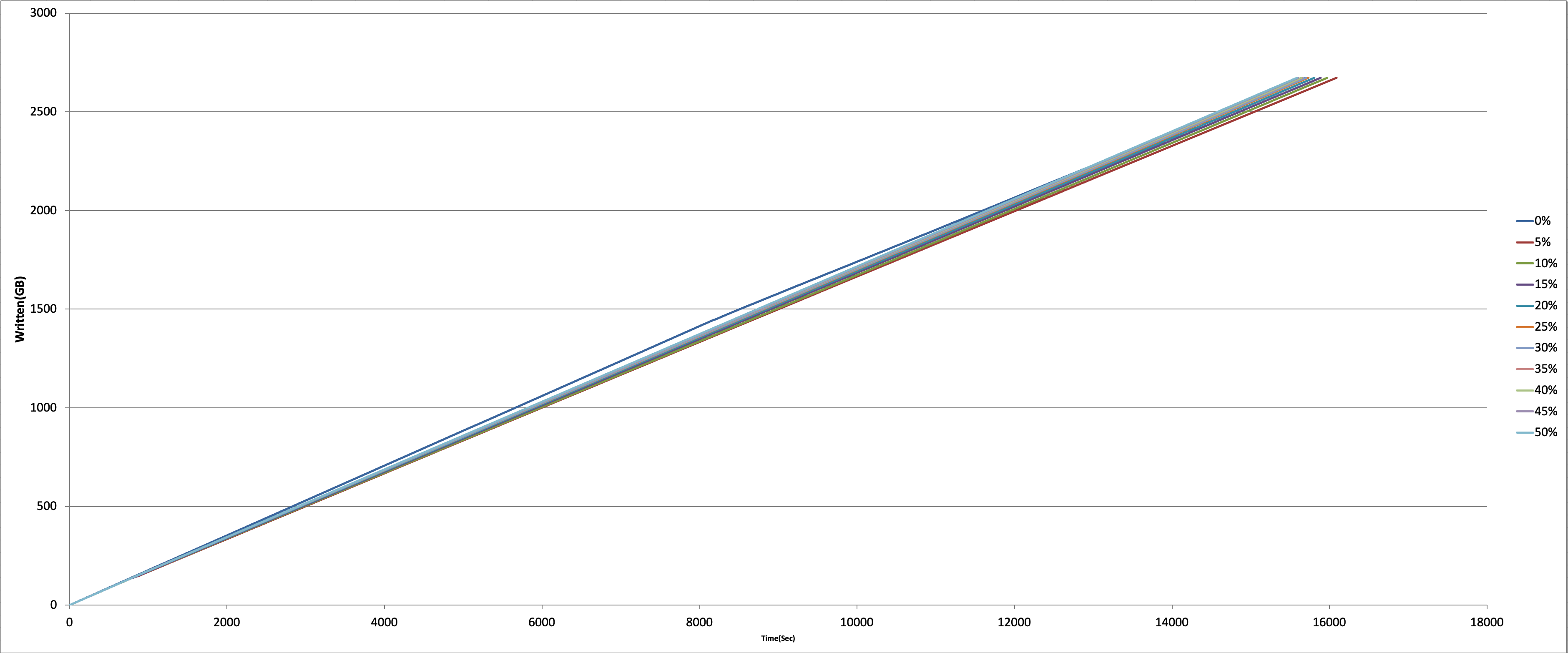 Jednak liczba IOPS w zależności od ilości zapisanych danych jest już różna dla różnych poziomów OP: